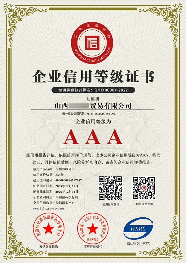 企業(yè)AAA信用等級(jí)證書(shū)主要包含:AAA企業(yè)信用等級(jí)、AAA企業(yè)資信等級(jí)、AAA重合同守信用、AAA質(zhì)量服務(wù)誠(chéng)信企業(yè)、AAA誠(chéng)信經(jīng)營(yíng)示范單位、誠(chéng)信企業(yè)家、誠(chéng)信經(jīng)理人、AAA重質(zhì)量守信用、AAA重服務(wù)守信用、AAA誠(chéng)信供應(yīng)商等。我們將一如既往繼續(xù)努力,能夠和您合作是我們的榮幸!山西AAA企業(yè)信用評(píng)級(jí)網(wǎng)本著“誠(chéng)信、專業(yè)、優(yōu)質(zhì)、高效”的宗旨為廣大客戶提供全方位的認(rèn)證咨詢服務(wù),本公司愿與廣大的新老客戶真誠(chéng)合作、攜手共進(jìn)!